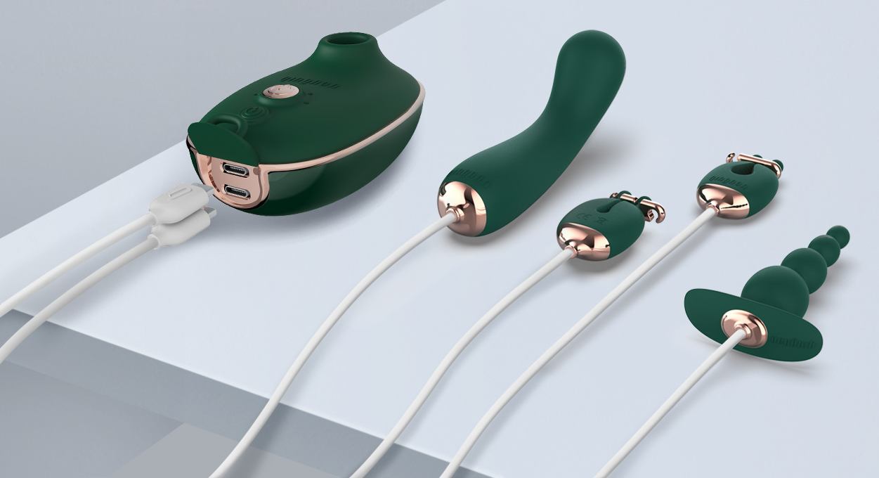 В нижней части вакуумного стимулятора расположены два водонепроницаемых порта USB type-c, через которые можно как заряжать устройство, так и подключать и управлять двумя аксессуарами одновременно!