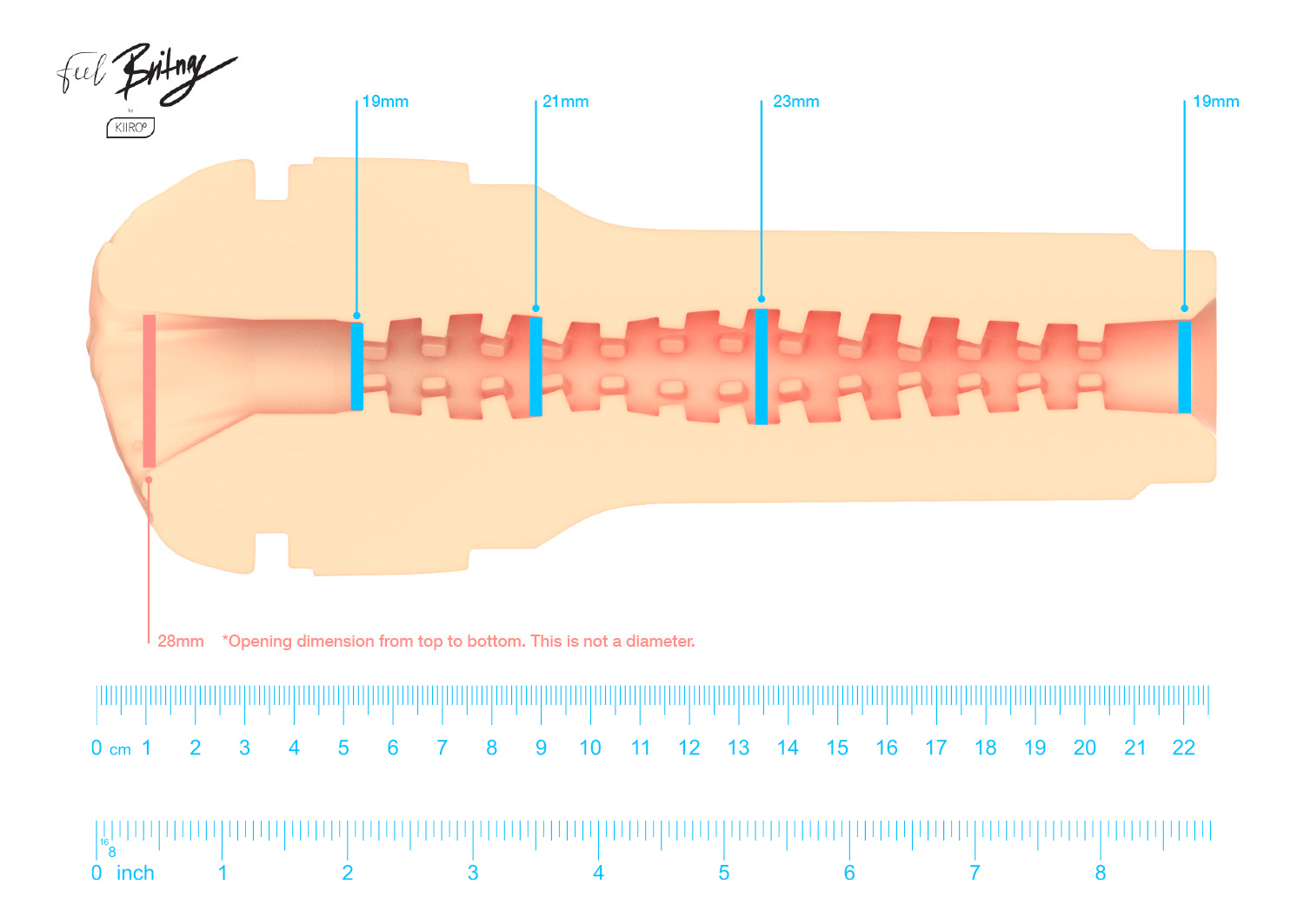 У процесі виготовлення іграшки було враховано, що діаметр жіночого вагінального отвору звужується та розширюється, тому на картинці ви можете помітити, що діаметр внутрішньої частини варіюється від 19 мм до 23 мм. Слід зазначити, що при зануренні пеніса діаметр безумовно розтягується, тому можете не турбуватися, що мастурбатор не підійде вам за розміром.